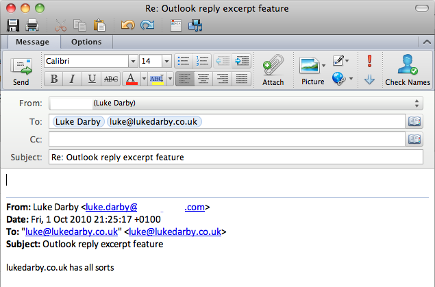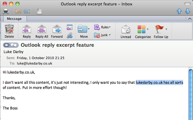 When you receive an email, sometimes it’s useful to be able to hit reply but to not include the entire original mail body, just the portion to which you are wishing to comment upon or draw attention to. It’s simple in Outlook 2011 for mac, you highlight the portion you wish to include in your reply, as normal