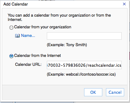 You’ll now see a calendar has been added called ‘reachCalendar’ and you’ll get a pop-up message saying that sync can take upwards of 10 minutes. just acknowledge the window. The reason for the name is in the webcal:// link right at the end. I guess you could rename it in the link, I wouldn’t bother.